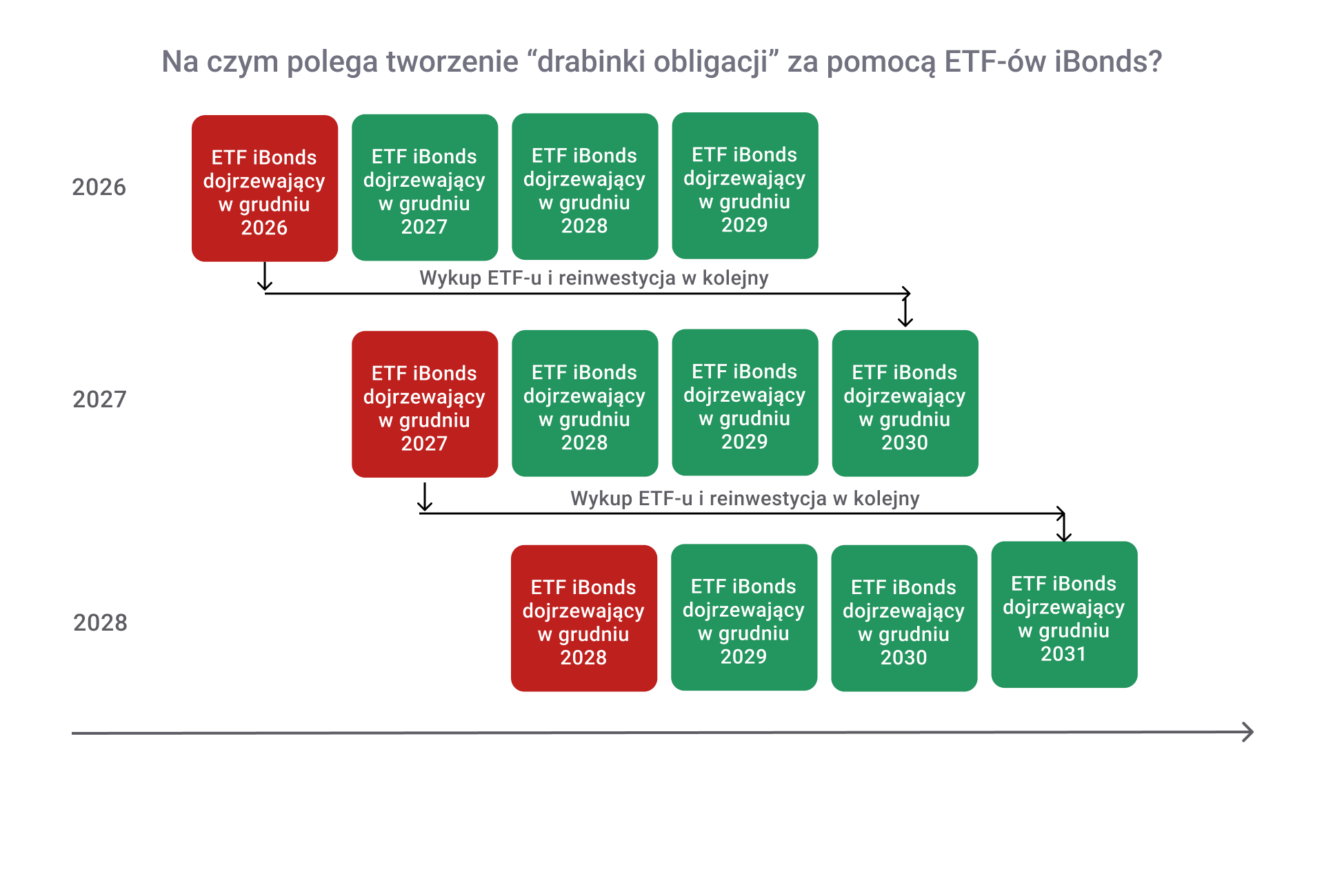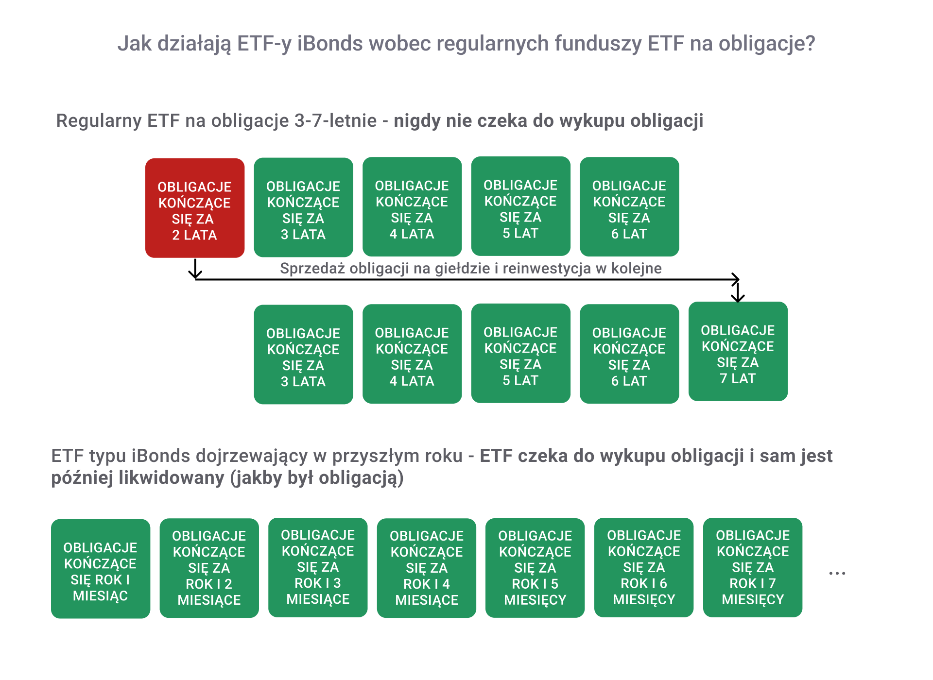 Jeśli trudno jest Ci sobie wyobrazić sposób działania ETF-ów obligacyjnych, to pokażę to teraz w uproszczony sposób na przykładzie ETF-u na obligacje 3-7-letnie. Załóżmy, że w każdym roku emitent dokonuje emisji wyłącznie 1 serii obligacji i jesteśmy teraz na początku danego roku. Jeszcze wczoraj ten ETF w portfelu miał obligacje kończące się za – odpowiednio – 3, 4, 5, 6 i 7 lat, ale już dzisiaj niektóre z nich skończą się za 2 lata, inne za 3, 4, 5 i 6 lat. Jako że ETF śledzi indeks obligacji 3-7-letnich, to musi teraz sprzedać te, które dojrzewają za 2 lata i kupić takie, które dojrzeją za 7 lat. Oznacza to, że nigdy nie doczekamy się wykupu obligacji z portfela tego ETF-u, a zamiast tego zawsze będzie musiał sprzedawać na rynku obligacje ze swojego portfela i kupić inne (by trzymać „na sztywno” dojrzałość 3-7 lat dla obligacji w swoim portfelu).