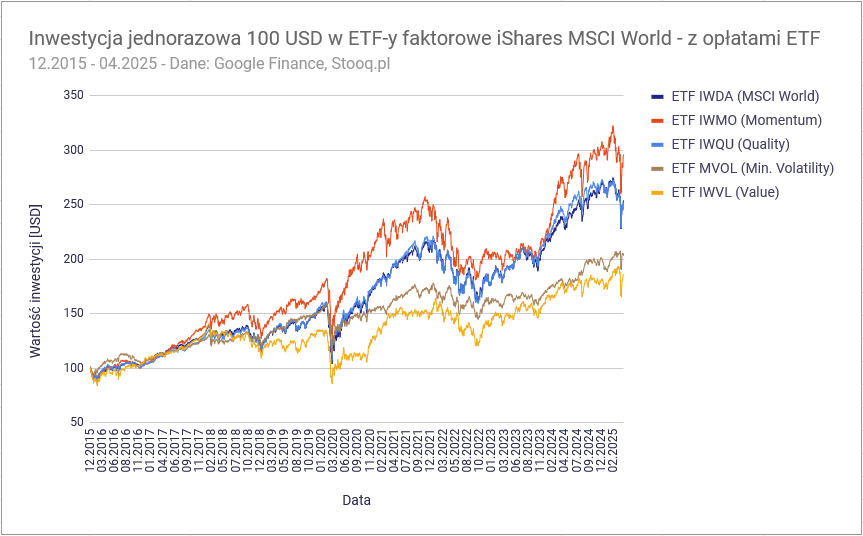 Zacznę od zbadania wyników pięciu ETF-ów (w USD) od końca 2015 roku do kwietnia 2025, czyli przez niespełna 10 lat. Szybkie wnioski po zerknięciu na wykres są takie, że najlepiej radzi sobie Momentum – IWMO, a następnie praktycznie ex aequo są ETF na szeroki indeks MSCI World – IWDA oraz ETF Quality – IWQU. Znacznie gorzej od nich radzą sobie ETF-y MVOL (Min. Volatility) oraz IWVL (Value), z tym że Value jest dosyć zmienne, a Minimum Volatility faktycznie wykazuje dużo mniejszą zmienność od pozostałych, czyli dobrze spełnia swoją funkcję: