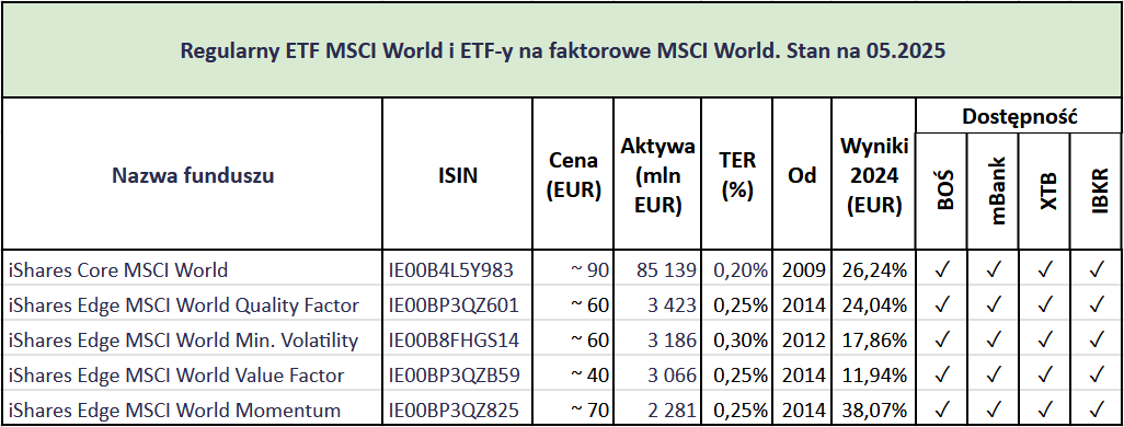 Poznajmy teraz aktualną ofertę i szczegóły dot. ETF-ów na 4 faktory zestawionych z szerokim indeksem MSCI World.
