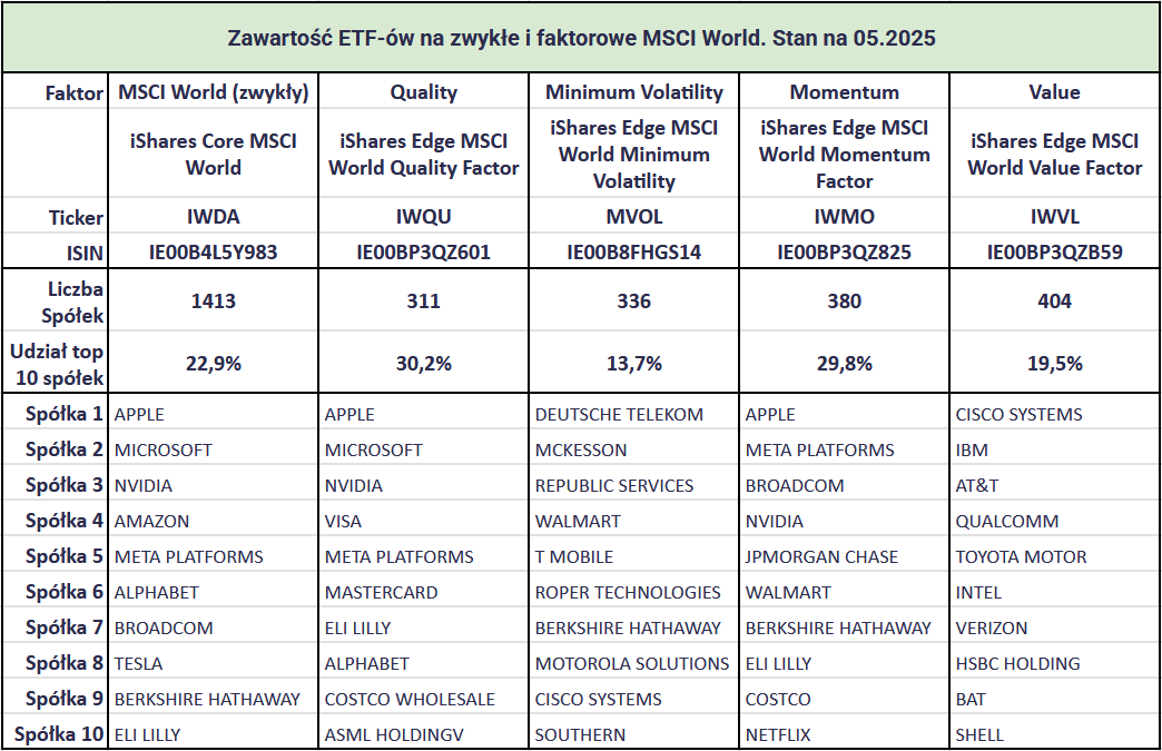 Składy pięciu ETF-ów są bardzo zróżnicowane, bo największy iShares Core MSCI World, czyli szeroki indeks ma ponad 1400 spółek w składzie, a pozostałe ETF-y mają ich około 300-400. Jeśli nie lubisz, gdy największe kilka spółek stanowi zbyt dużą część portfela funduszu, to spodoba Ci się iShares Edge MSCI World Min. Volatility (MVOL), w którym największe 10 firm stanowi tylko niespełna 14% udziału. Quality i Momentum są mocno skoncentrowane, bo największe 10 spółek w ich składzie stanowi aż około 30% udziału ETF-u, czyli więcej niż w szerokim MSCI World, w którym jest to 23%.