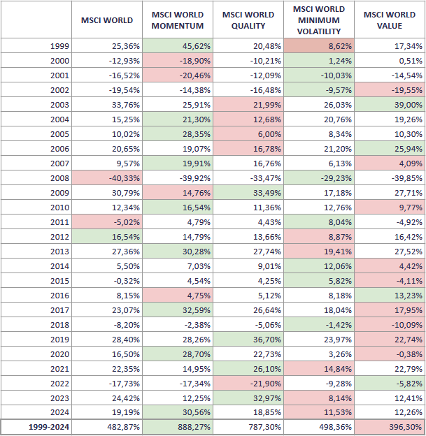 Myślę, że MSCI World jest dokładnie tak, gdzie spodziewałbym się go znaleźć, czyli mniej więcej na środku. Ma najwięcej spółek, niczego nie wybiera, stąd i jego wynik jest przeciętny na tle indeksów czynnikowych. Jeszcze więcej o faktorach dowiemy się z rzutu okiem na wyniki rok do roku każdego z indeksów.