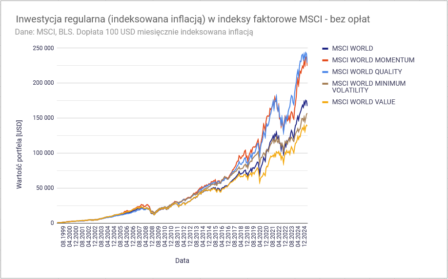 Zmiana perspektywy z jednorazowej inwestycji na regularne oszczędzanie i inwestowanie potrafi sporo namieszać, zwłaszcza jeśli indeksujemy wpłatę inflacją. Dlatego w tej symulacji skorzystałem z inflacji amerykańskiej, zakładając, że na początku czyli w styczniu 1999 roku wpłacamy 100 USD miesięcznie, co przy indeksacji inflacją sprawiło, że w grudniu 2024 roku wpłaciliśmy już 260, a nie 100 USD. Takie ujęcie sprawia, że wyniki ulegają przetasowaniu, o czym świadczy dość dobitnie to, że w tej symulacji wygrał indeks MSCI World Quality, który nieznacznie pokonał MSCI World Momentum, oferując dodatkowo niższą od tego drugiego zmienność: