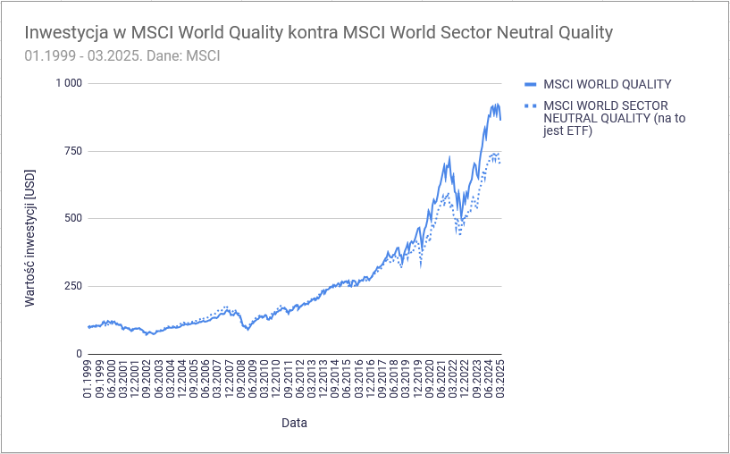 BlackRock wybrał dla faktora Quality indeks MSCI World Quality Sector Neutral, bo w latach 1999 – 2014 na ogół wygrywał z „czystym” Quality. Niestety w ostatniej dekadzie radzi sobie już znacznie gorzej od oryginału, co widać w porównaniu wyników obydwu indeksów: