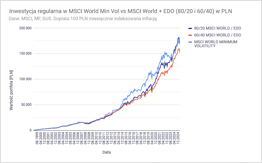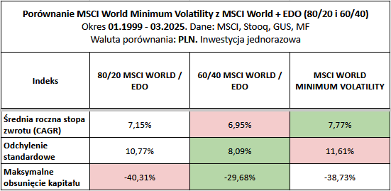Kilka osób sugerowało mi kiedyś porównanie inwestycji w MSCI World Minimum Volatility z inwestycją w portfel mieszany zawierający klasyczny MSCI World oraz obligacje EDO. Co ciekawe, rezultat takiej symulacji pokazuje, że zakup 100% ETF-u MSCI World Minimum Volatility jest bardzo podobną inwestycją (przynajmniej w latach 1999 – 2024) do portfela 80% MSCI World + 20% Obligacji EDO. 100% ETF-u na MSCI World Minimum Volatility wykazało nieco wyższą średnią roczną stopę zwrotu, nieco wyższą zmienność i bardzo podobne maksymalne obsunięcie wartości portfela od szczytu: