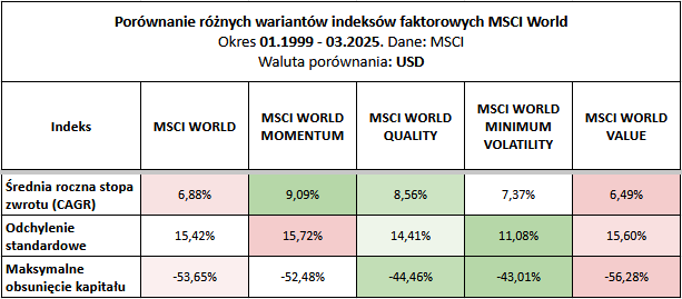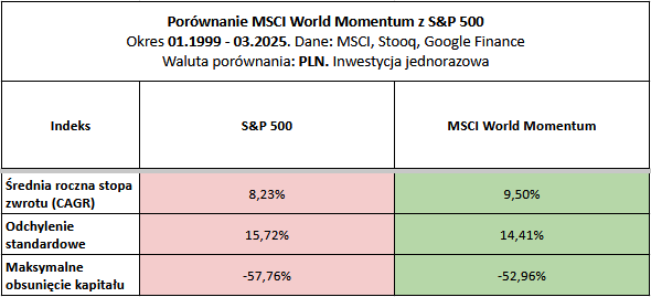Wyższa średnia roczna stopa zwrotu, niższe odchylenie standardowe i niższe maksymalne obsunięcie kapitału od szczytu? Brzmi zbyt dobrze by było prawdziwie? Bo nie jest prawdziwie, biorąc pod uwagę to, że na S&P 500 mamy ETF-y o koszcie rocznym 0,05%, a iShares Edge MSCI World Momentum Factor kosztuje 0,25% rocznie, co w te 25 lat sprowadziłoby wyniki do bardziej zbliżonych poziomów.