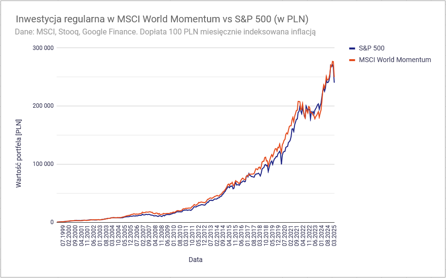 Dla regularnego inwestowania kwoty indeksowanej inflacją MSCI World Momentum również wygrywa z S&P 500 (czego nie widać na wykresie, ale kończy z wynikiem o prawie 10 000 PLN wyższym niż konkurent). Widać jednak jego przewagę nad S&P 500 przez prawie cały badany okres: