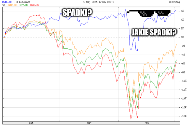 Ta symulacja wsteczna nie uwzględnia wpływu podatków przy rebalancingu na inwestycję. Jeśli wzięlibyśmy je pod uwagę, to prawie na pewno 80/20 MSCI World + EDO przegrałoby z MSCI World Minimum Volatility. iShares Edge MSCI World Min. Volatility (IE00B8FHGS14, MVOL) może być zatem dobrym substytutem portfela 80/20 z klasycznym indeksem spółek z rynków rozwiniętych i 20% obligacji EDO dla kogoś, kto chce prowadzić prosty portfel złożony z 1 instrumentu. Taki trochę Vanguard LifeStrategy 80/20, ale w wersji z MSCI World i mający 100% akcji, tyle że tych o niskiej zmienności, a te (jak widać) zazwyczaj tracą trochę mniej od reszty w kryzysowych sytuacjach. Jako bonus mały mem z Minimum Volatility (wykres niebieski) w roli głównej w trudnych dla giełdy pierwszych miesiącach 2025 roku:
