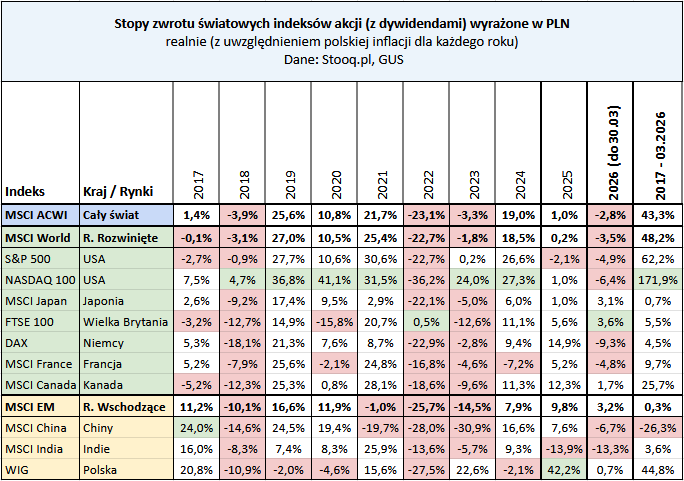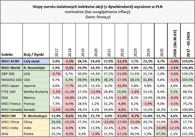 Z perspektywy polskiego inwestora miniony już rok 2025 nie był za dobry dla większości głównych indeksów akcji. Wyjątkiem jest oczywiście rodzimy WIG, który w tym okresie wielokrotnie przebił wyniki indeksów amerykańskich oraz światowych. Pierwsze 3 miesiące 2026 roku nie wyglądają najlepiej dla większości indeksów akcji, choć globalny MSCI ACWI trzyma się w okolicy zera (pomaga mu kurs USD/PLN), a amerykański S&P 500 w okolicy minus 3-4%. WIG jakimś cudem jest dalej na plusie, ale jest to niewielki zysk +2,1% od początku roku i nawet na polskiej giełdzie widać spore ochłodzenie związane z konfliktem na Bliskim Wschodzie.