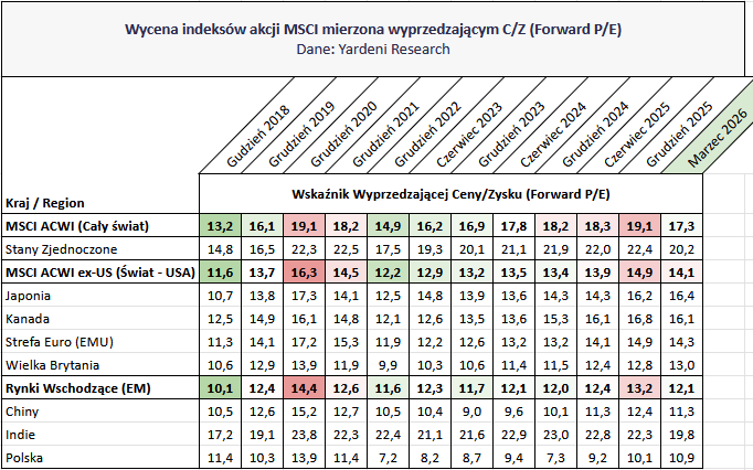 • Indeks światowy MSCI ACWI jest obecnie wyceniany rozsądniej niż od czerwca 2024 (17,3 wobec 17,8-19,1).