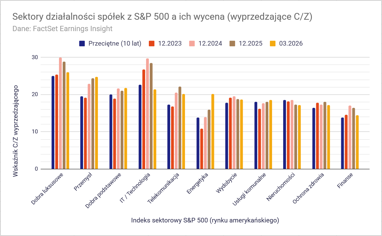 Poza wyżej wymienionymi największe zmiany dotyczą sektora dóbr luksusowych (do którego należą m.in. Amazon i Tesla widziane przez wielu jako spółki technologiczne) oraz finansów, bo obydwie części rynku w ostatnich kilku kwartałach mocno staniały. Co ciekawe, finanse są najtańszym obecnie sektorem i w tandemie z nieruchomościami i ochroną zdrowia zamykają stawkę pod względem wyceny. To rzadka sytuacja, która daje wyraz niepewności giełdy, ale nie sądziłem, że tak szybko zobaczymy „przeceny” w sektorach, które nie tak dawno temu dominowały pod kątem wycen (widać to po granatowych słupkach z wartością średniego wyprzedzającego C/Z dla okresów 10-letnich).