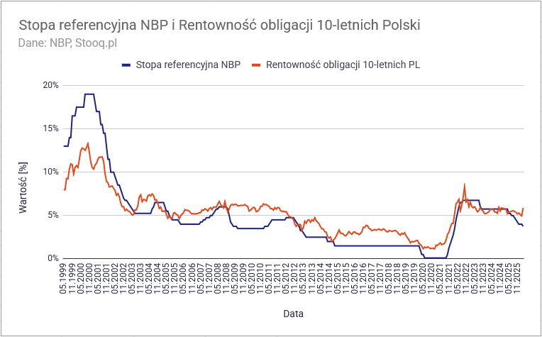 Na rynku polskich obligacji mamy dość ciekawą sytuację, w której rośnie przepaść między rentownością obligacji 10-letnich a stopą referencyjną NBP, będącą na ogół górną granicą oprocentowania lokat oferowanych przez banki. Rentowność obligacji 10-letnich na ogół potrzebowała przynajmniej kilku lat, by podążyć za stopami procentowymi (i zwykle całkiem słusznie pozostawała przynajmniej 1-2 p.p. wyżej od stóp procentowych), więc na znaczne obniżki rentowności przyjdzie nam jeszcze prawdopodobnie trochę poczekać.