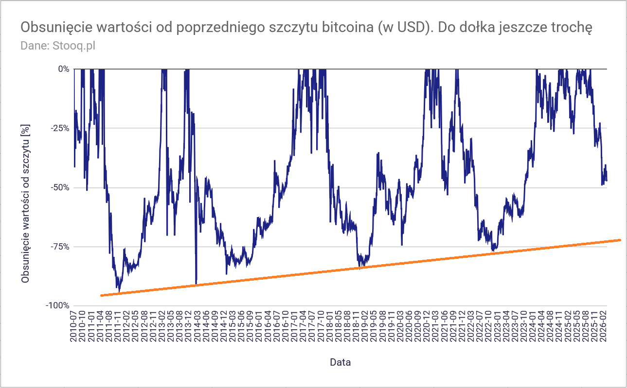 Jest to rzecz jasna wróżenie z fusów i obstawianie, że ludzie dalej widzą w bitcoinie wartość, którą widzieli w poprzednich cyklach halvingowych. Choć wielu ekspertów kryptowalutowych już dawno ogłosiło koniec z cyklami, to BTC uparcie zachowuje się tak, jak gdyby cykle dalej działały, więc pozostaje trochę poczekać i sprawdzić samemu, czy kurs BTC spadnie w rejony 30-40 tys. USD. Dla entuzjastów kryptowalut kurs BTC nawet teraz jest atrakcyjny, bo zbliżamy się do -50% od poprzedniego szczytu, który przypadł w październiku 2025 roku. To by było na tyle, jeśli chodzi o dobre wiadomości, bo jest też coś niesamowicie negatywnego, jeśli chodzi o BTC.