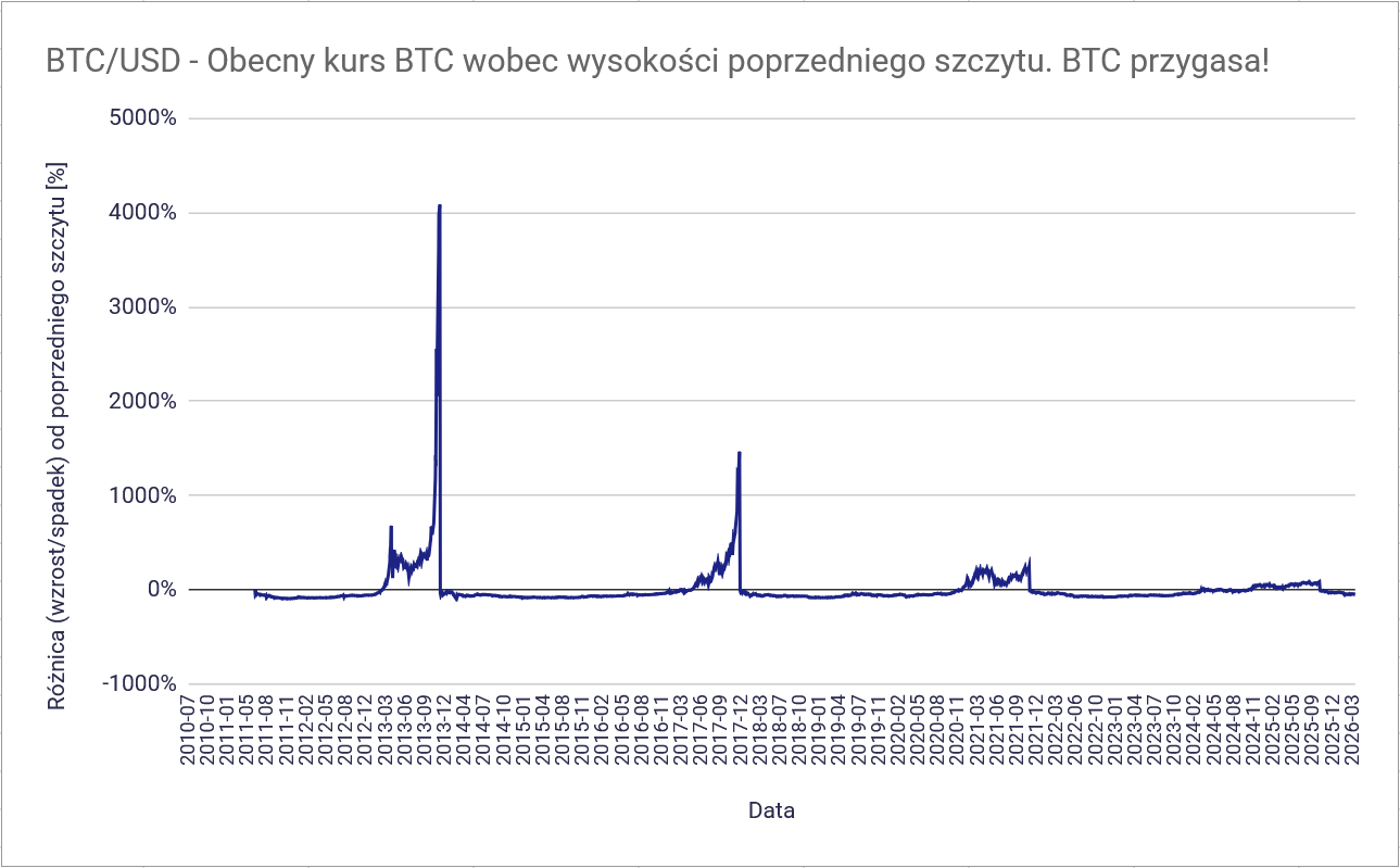 Mimo że obsunięcia od szczytu są podobne z każdym kolejnym cyklem, to każdy kolejny szczyt jest nieco niżej wobec poprzedniego. Ci, którzy pamiętają szczyty 2013 i 2017 mogą szczycić się gigantycznymi zyskami z kryptowalut, ale w 2021 i w 2025 wzrosty – choć stale imponujące – wskazywały na to, że BTC gaśnie.