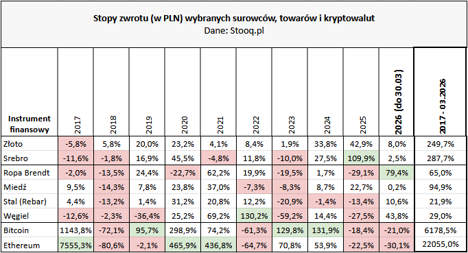 Towary, kruszce, surowce i kryptowaluty w marcu 2026 roku