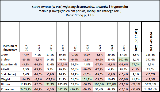 Bardzo wielu osobom surowce i metale szlachetne kojarzą się z przeciwdziałaniem inflacji. Jest to złe skojarzenie, bo gdy skorygujemy stopy zwrotu o polską inflację, zobaczymy, jak często (w jak wielu latach) te klasy aktywów przegrywały z inflacją. Dla wielu będzie to wprost szokujące, ale np. srebro równie często wygrywało, co przegrywało z inflacją, co nie zmienia faktu, że imponujące +102,6% powyżej inflacji w roku 2025 sprawia, że zarówno złoto, jak i srebro poradziły sobie z inflacją w latach 2017 – 2025 bezproblemowo. Po prostu w krótkich terminach nie ma tu żadnej gwarancji pobicia inflacji i są historyczne daty zakupu, po których złoto przegrywałoby z amerykańską inflacją nawet przez ponad 40 lat (warto wiedzieć), więc dajmy sobie wreszcie spokój z mylną narracją o tym, że złoto zawsze i niezależnie od ceny zakupu pokonywało w krótkim i średnim terminie inflację.