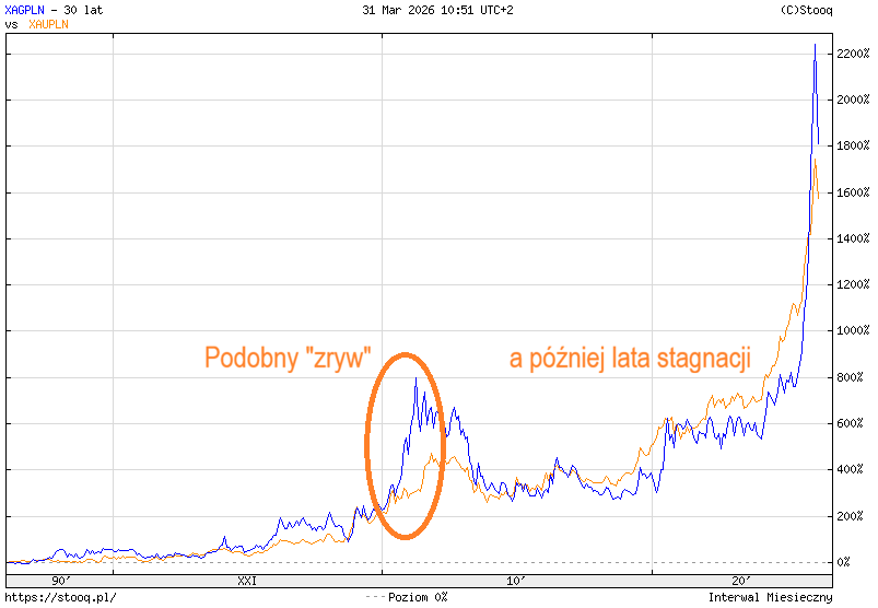 Metale szlachetne mają wreszcie swoje pięć minut, bo od początku 2024 roku znacząco wzrosła zarówno cena złota, jak i cena niedocenianego wcześniej przez lata srebra. Rok 2026 przyniósł na razie ochłodzenie, które w tabeli pokazującej stopy zwrotu z trzech pierwszych miesięcy 2026 roku nadal wygląda na wzrost, ale gdy przyjrzymy się wykresowi, to widać na nim wyraźne zahamowanie trendu wzrostowego. Przypomina to zresztą „zrywny” styl wzrostów cen złota i srebra z lat 2009 – 2011, po których mieliśmy coś, co w najlepszym wypadku mogę nazwać latami stagnacji: