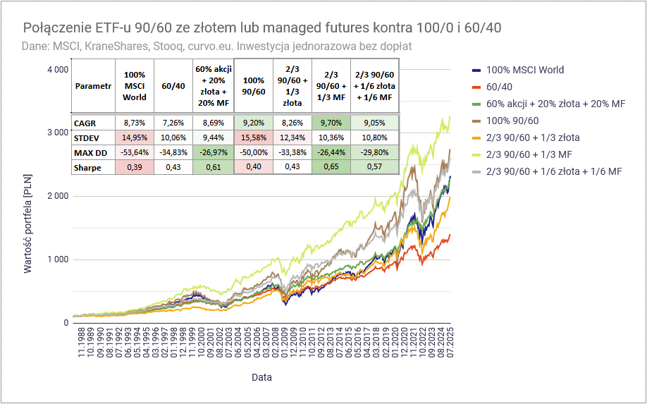 Jako że jest to podrozdział o tym, czemu warto kupić lewarowany 60/40, to pokażę Ci teraz wyniki połączenia tego ETF-u w portfelu z czymś innym, np. złotem lub strategią Managed Futures (KFA MLM), na którą istnieje amerykański ETF KMLM. Dla większości będzie to skomplikowana inżynieria finansowa, ale analiza wsteczna dla lat 1988 – 2025 dowiodła, że połączenie 2/3 ETF-u 90/60 z 1/3 ETF-u Managed Futures dało najlepszy efekt, jeśli chodzi o stopę zwrotu i o obsunięcia kapitału przy satysfakcjonującej zmienności tylko nieco wyższej niż klasycznego portfela 60/40.