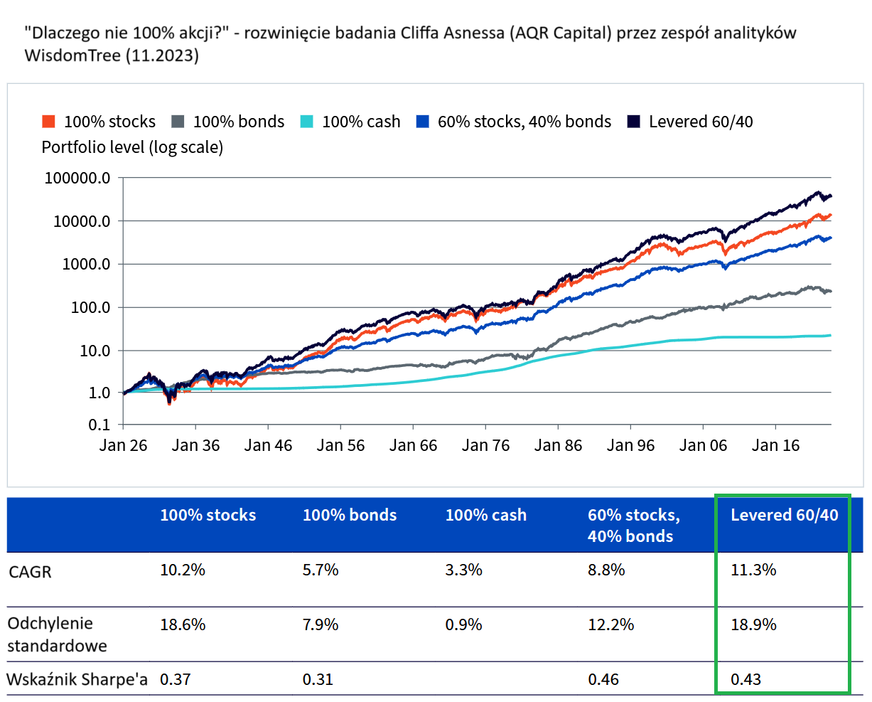 Skąd pomysł na portfel „zawierający” 90% akcji i 60% obligacji skarbowych? Wszystko zaczęło się od Cliffa Asnessa, jednego z założycieli firmy inwestycyjnej AQR Capital, który w materiale „why not 100% equities?” z 1996 roku,, dowodzi tego, że 100% akcji nie jest najlepszym portfelem pasywnym pod względem stosunku zysku do ryzyka. Jego badania dowiodły tego, że historycznie o wiele lepszy byłby portfel 60/40 na dźwigni wynoszącej około 1,55×, bo przy podobnym poziomie ryzyka (zmienności), zaoferowałby wyższą od akcyjnej stopę zwrotu. Badania te rozszerzyło o kolejne lata (do 2023 roku) WisdomTree, prezentując wyniki na swojej stronie internetowej.