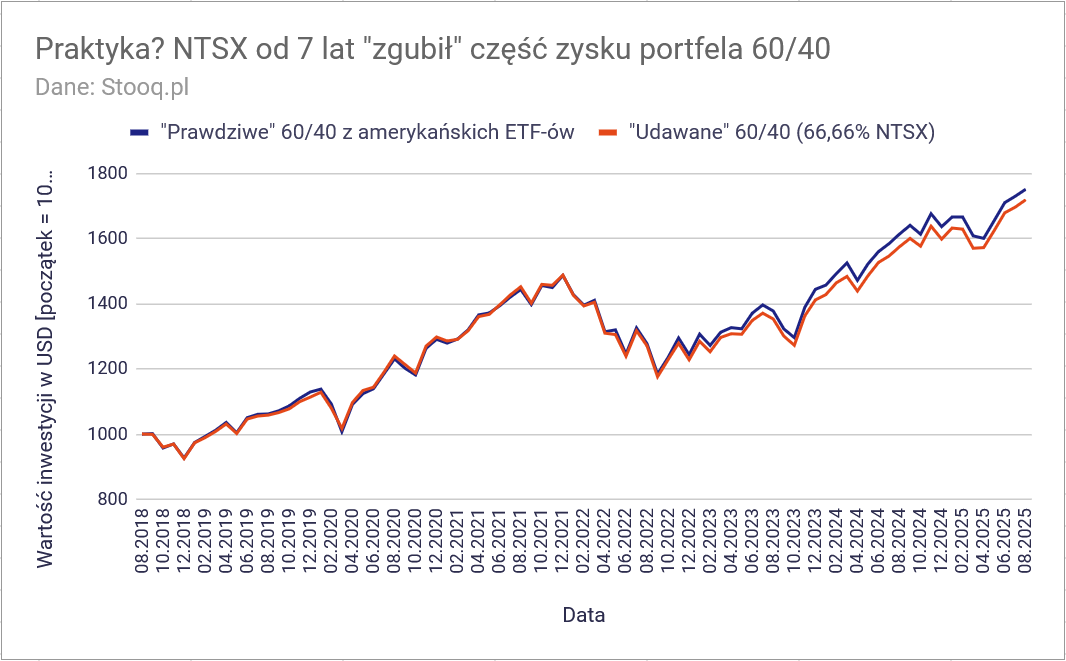 • NTSX przez 7 lat istnienia radził sobie trochę gorzej od „benchmarku” (własnej symulacji tego, co powinien replikować). Wykorzystanie dźwigni niesie ryzyko nieprzewidywalnych, często gorszych od benchmarku (samodzielnej symulacji portfela 90/60) wyników. Amerykański NTSX (ten istniejący od ponad 7 lat) zdążył w ciągu tych kilku lat istnienia „zgubić” około 3% (lub 0,28% rocznie) stopy zwrotu.