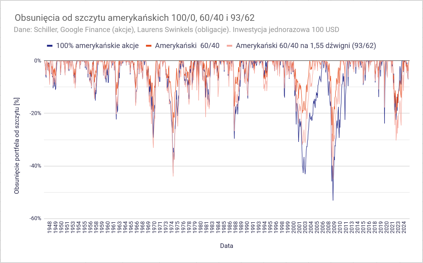 Podobnie jest z profilem obsunięć wartości portfela, gdzie lewarowany 60/40 wypada nieznacznie lepiej od portfela 100% akcji, ale dużą poprawę profilu obsunięć przynosi regularny portfel 60/40, a nie „konstrukt inżynierii finansowej” jakim jest portfel 93/62. Obsunięcie rzędu -45% zamiast -53%? Prawdopodobnie, gdybym dokonywał symulacji na danych dziennych, a nie miesięcznych, to obsunięcie mogłoby być jeszcze głębsze i tym samym bardziej podobne do portfela 100% akcji. Nie mówiąc o tym, że czasami (np. w 1981 lub 2022 roku) portfel 93/62 miałby głębsze obsunięcia od portfela 100% akcji.