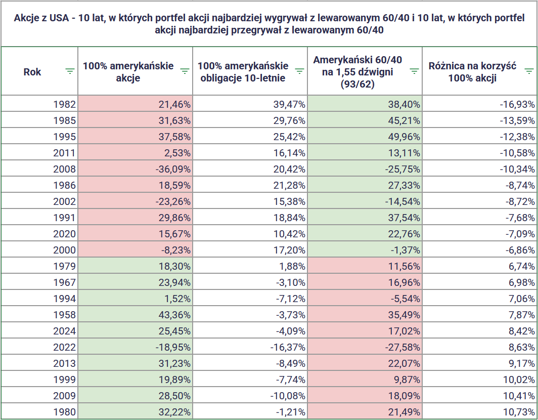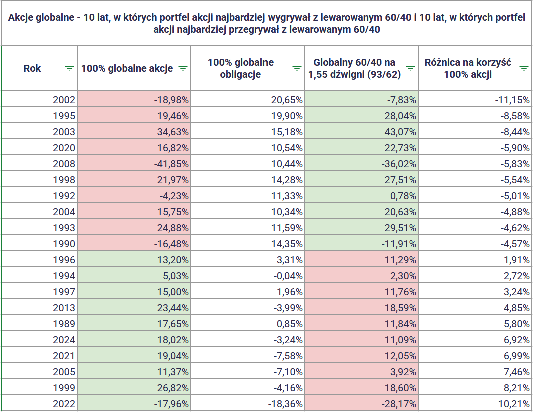Jeśli strategia inwestycyjna wygrywa z inną, to rozsądny inwestor powinien zawsze zadać sobie pytanie „dlaczego tak jest?”, bo jeśli tego nie zrobi, będzie niewolnikiem danych i swoich założeń. Przeanalizuję teraz lata, w których lewarowany 60/40 najbardziej wygrywał z portfelem 100% akcji oraz te, w których najmocniej z tamtym przegrywał, co da nam dodatkowy pogląd na to, czemu strategia pobijała w długim terminie portfel akcyjny.