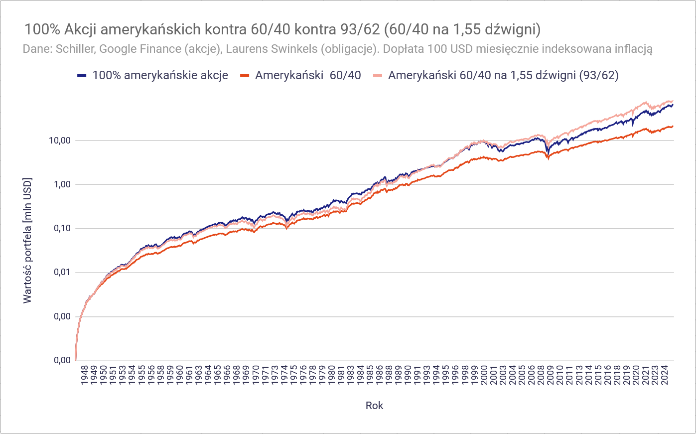 Wyniki lewarowanej strategii 60/40 (93/62) są tutaj dość podobne, co poprzednio, ale strategia z dźwignią zaczyna szybciej wychodzić na prowadzenie, bo 100% akcji rządzi „tylko” w latach 1950 – 1994, a potem ustępuje pierwszeństwa lewarowanemu 60/40. Pod koniec regularnego inwestowania strategia lewarowanego 60/40 przyniosła dość znacząco więcej kapitału, bo prawie 82 mln USD wobec 66 mln USD dla portfela 100% akcji, co jest różnicą znaczącą, ale nie kolosalną (procentowo).