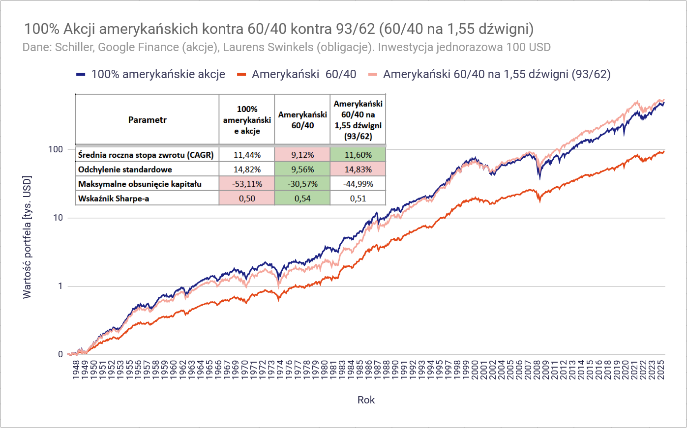 Dlaczego 93/62, a nie 90/60? Ponieważ dźwignia 1,55× daje właśnie takie proporcje portfela. Mamy tu wobec tego 93% akcji, 62% obligacji i -55% gotówki (obligacji krótkoterminowych USA) i tak wyliczam stopę zwrotu z portfela lewarowanego 60/40, zakładając miesięczny rebalancing jego składników. Analizę zaczynam w styczniu 1948 roku, kończąc w lipcu 2025 roku, co daje ponad 78,5 roku historycznych danych, mówiąc bardzo dużo o tej lewarowanej strategii. Jednorazowa inwestycja tego typu rozpoczęta prawie 80 lat temu przyniosłaby delikatnie wyższą stopę zwrotu od portfela 100% akcji (CAGR +11,6% rocznie wobec +11,44% rocznie dla akcji) oraz nieznacznie wyższe odchylenie standardowe (14,83% wobec 14,82%), co w efekcie daje niewiele wyższy wskaźnik Sharpe-a od inwestycji akcyjnej (0,51 wobec 0,50).